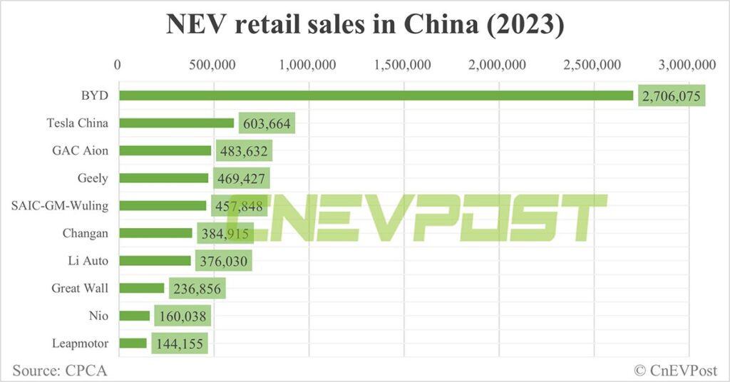 BYD’s retail sales of NEVs in 2023 were 2,706,075 units, up 50.3 percent from 1,799,947 in 2022, according to the CPCA.