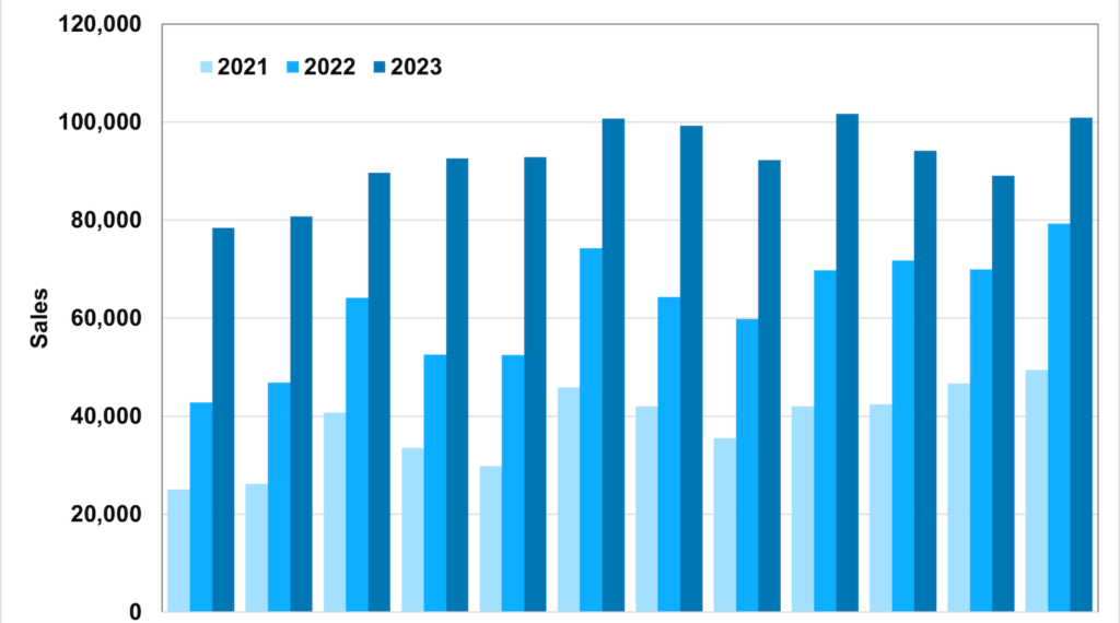 “A comparison of monthly EV sales data for the last three calendar years shows that for each individual month, EV sales increased significantly from the year before. The highest sales for a single month in 2021 was about 50,000 vehicles, for 2022 was about 80,000 vehicles, and in 2023 was over 100,000,” the US DOE writes. “Sales are often lowest in January following a rise that usually takes place in December.”